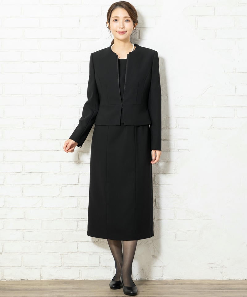 シャープなデザインが特徴のジャケットはサテンの二重襟デザイン。ウエストの1つホックでくびれ感を演出しスリムな印象に。ワンピースは縦のラインが際立つIラインシルエットでエレガントに。足元を露出させずに足さばきを良くするボックススリットを採用しています。
